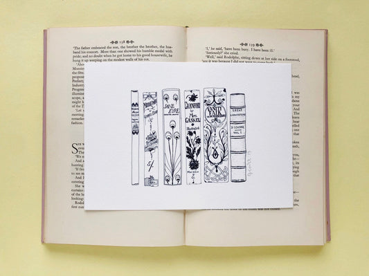 Jane Austen Novels Book Spine Ink Drawing Art print in Monochrome